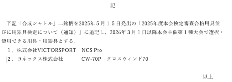 国際大会はまだ不明ですが、国内大会では合成シャトルが試合球として今後使われる可能性が出てきました。
